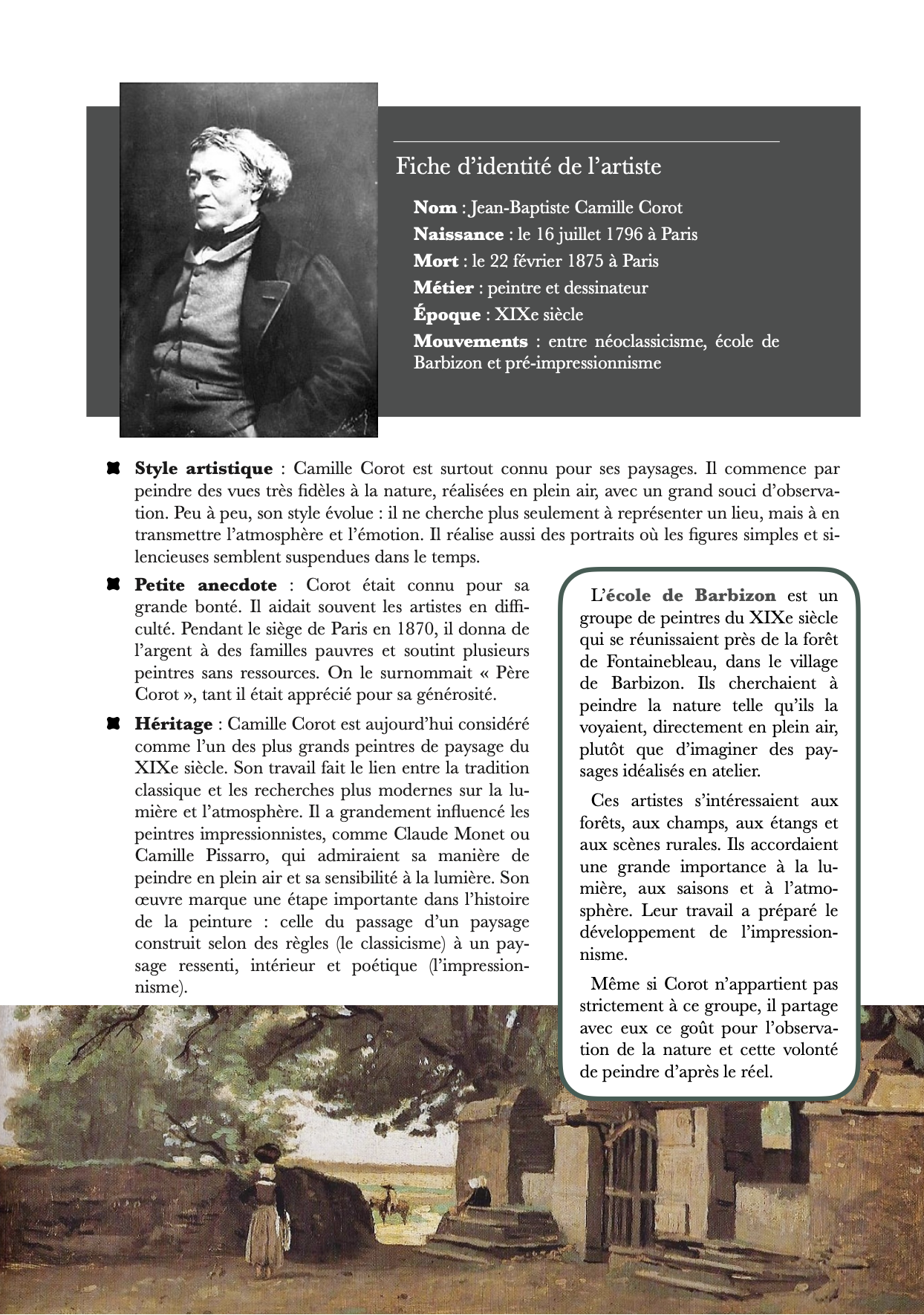 Étude d’œuvres d’art clé en main sur Jean-Baptiste-Camille Corot avec : biographie, plan de cours sur 12 semaines, 6 œuvres majeures analysées pas à pas, fichiers imprimables et travail de dessin.