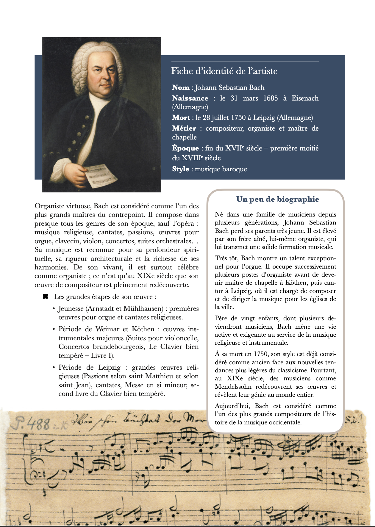 L’étude de compositeur consacrée à Johann Sebastian Bach (1685–1750), figure majeure de la période baroque, invite les élèves à découvrir une musique à la fois rigoureuse et très expressive.