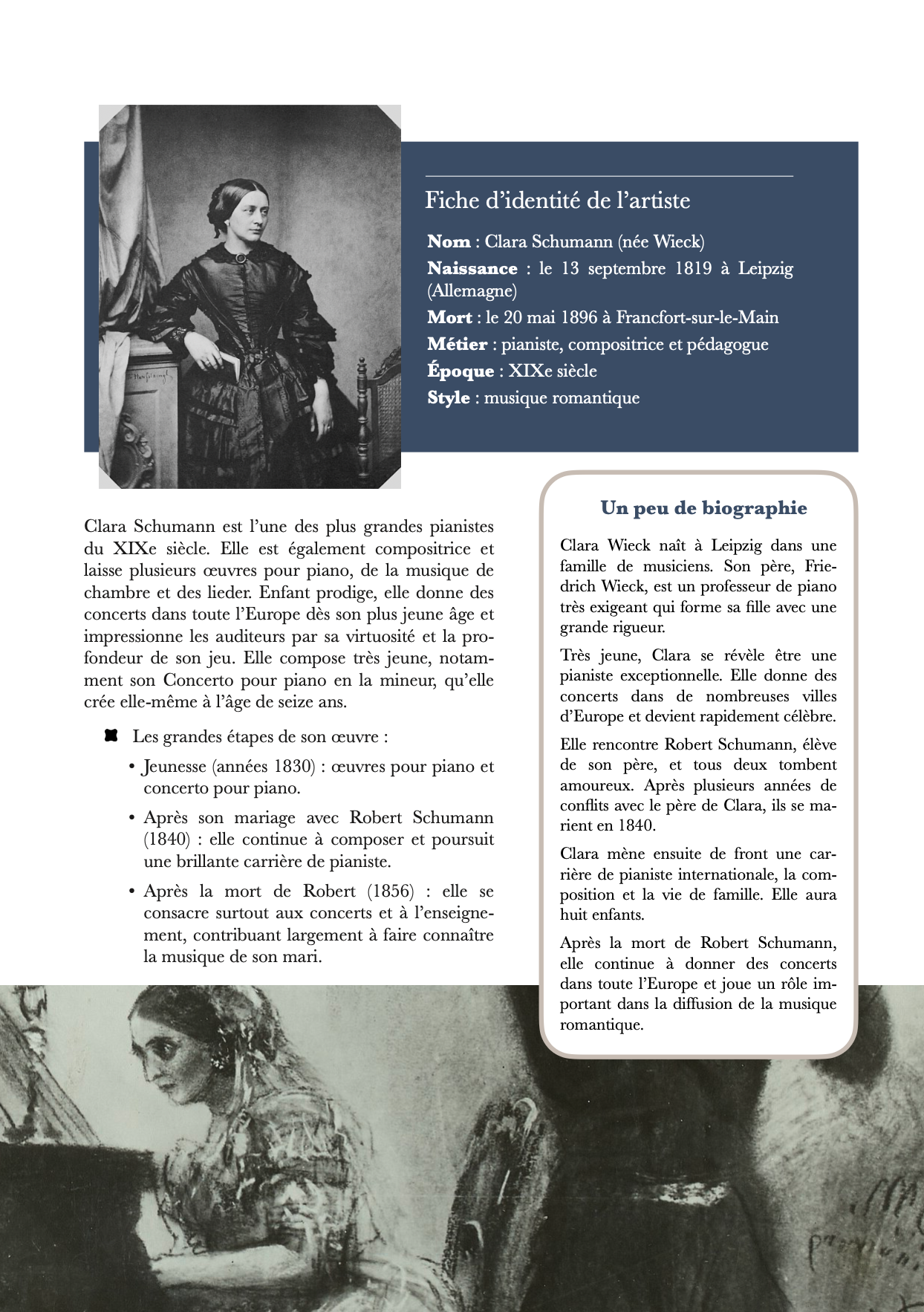 Cette étude de compositeur consacrée à Robert Schumann (1810-1856) et Clara Schumann (1819-1896), figures majeures de la musique romantique du XIXe siècle, invite les élèves à découvrir leur univers musical et leur place dans l’histoire de la musique.