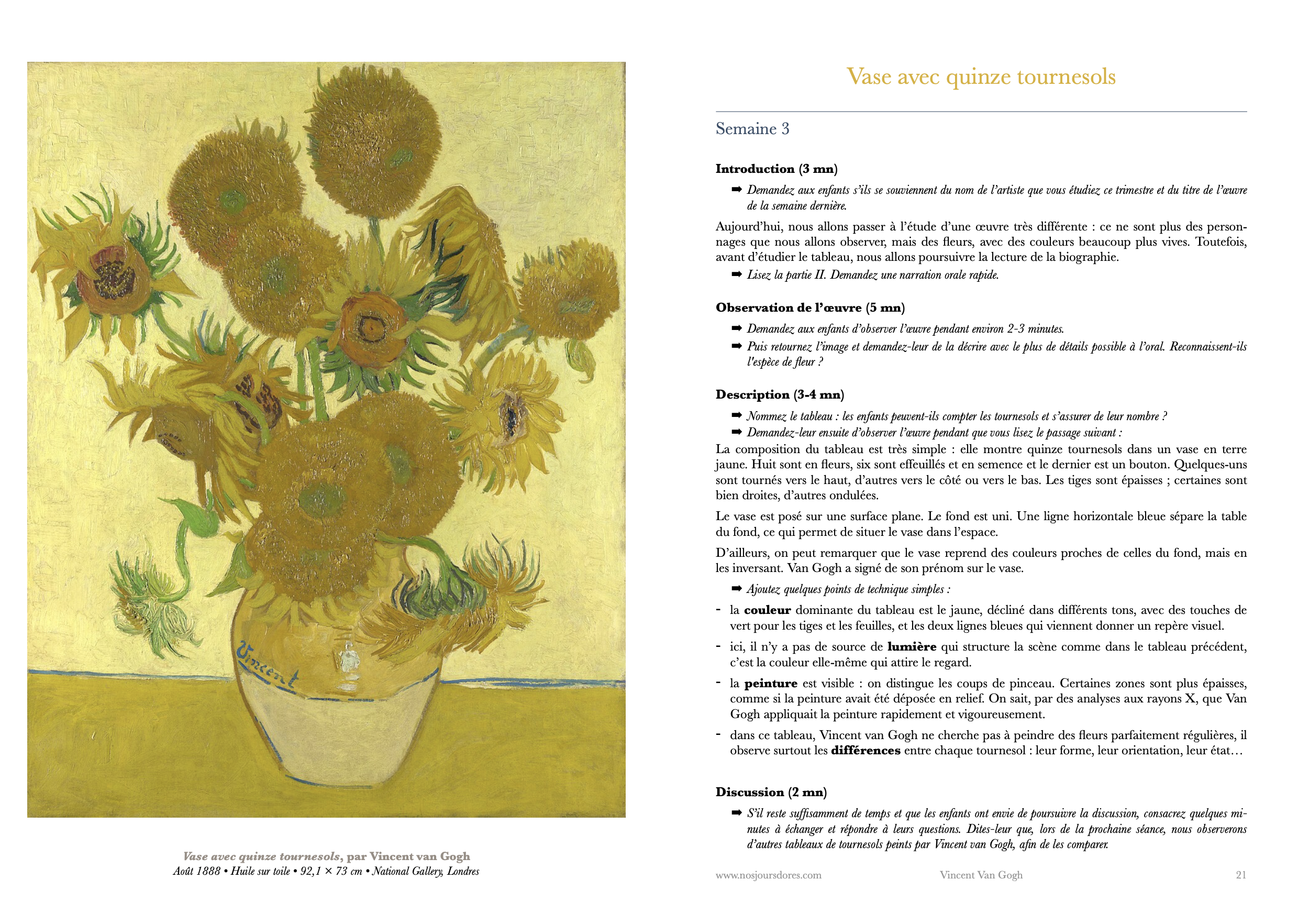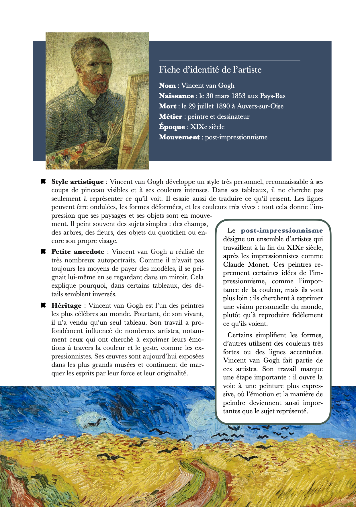Étude d’œuvres d’art clé en main sur Vincent van Gogh avec : biographie, plan de cours sur 12 semaines, 6 œuvres majeures analysées pas à pas, fichiers imprimables et travail de dessin.